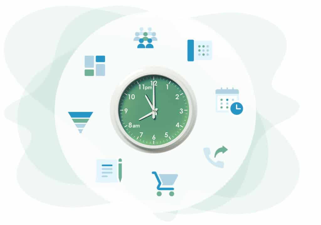Clock with images representing the types of answering services provided on a 24/7 basis.